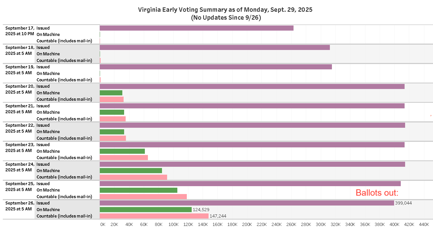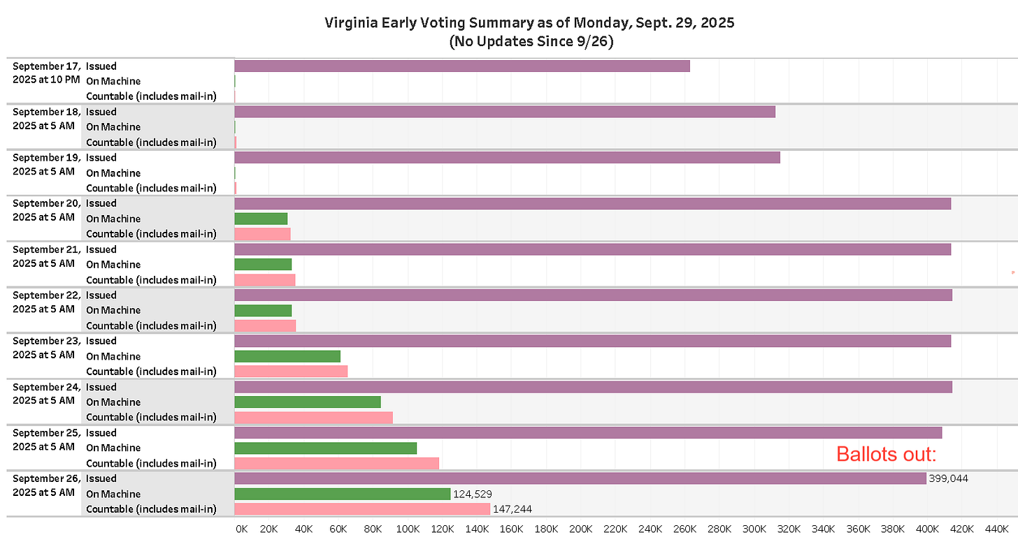 Other groups that rely on the DAL data, such as Virginia Public Access Project (VPAP), also appeared to be showing only ballot tallies as of Friday, Sept. 26 (which actually reflects day-before activity).