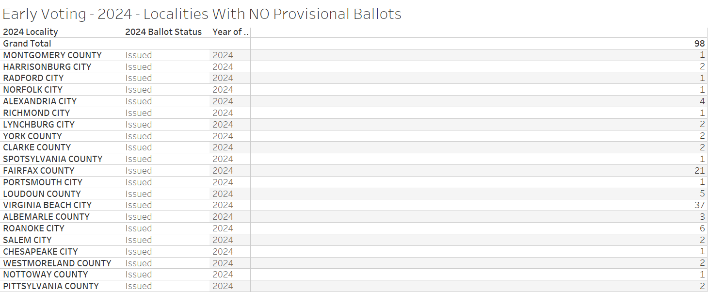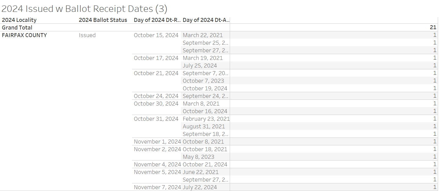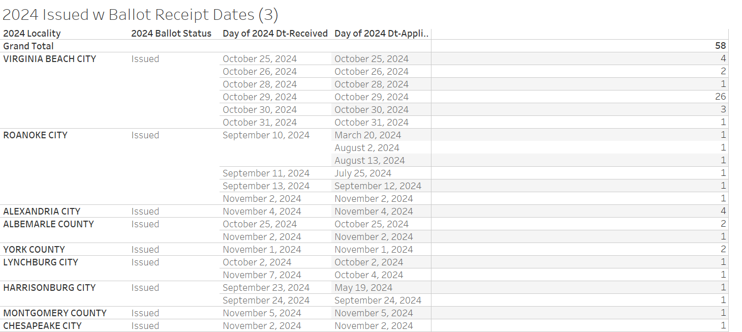 During the 2024 election, twenty-one (21) Localities had entries where Application Status = Approved, Ballot Status = Issued, and the Ballot Receipt Date field had a date entry. Virginia Beach led the Commonwealth of Virginia with 37 instances of Status / Ballot Receipt Date incompatibility. Fairfax County took 2nd Place with 21 instances (see table below).