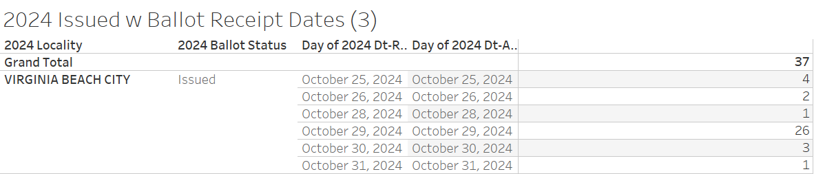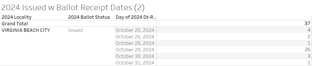 We surmised it MIGHT have been a data input error. Could an election official have entered the App Receipt Date into the Ballot Receipt Date field, instead of the App Receipt Date field? Interestingly enough, with Virginia Beach the App Receipt Date field entries exactly matched the Ballot Receipt Date entries for the 37 ballots in question (see below). Could that have happened elsewhere?