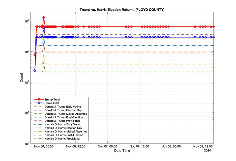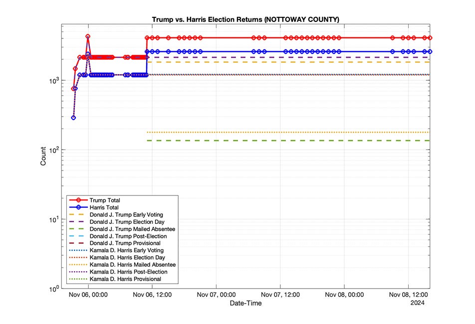 Then the data feed immediately removed the election day count information and began reporting just the Early Voting and Mailed Absentee numbers (5,593 Trump, 4,259 Harris), only to add the same Election Day totals back in to the data feed at 9:06 AM on Nov. 6th.