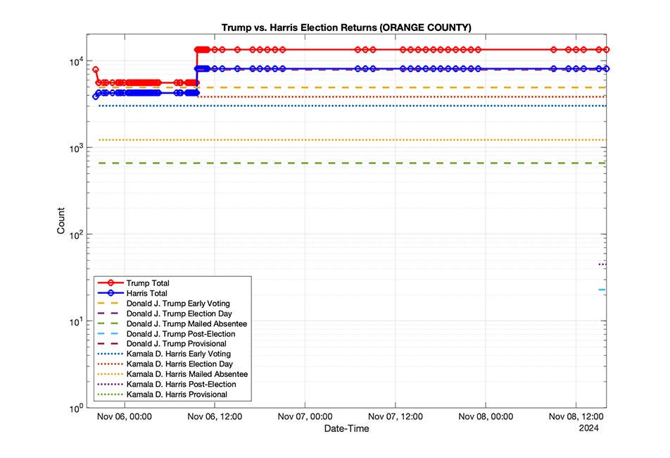 2. The second issue we noticed was that Orange County had the first report of their totals at 10:10 PM pm Nov. 5th, and initially reported the election day count for Donald Trump (7,891) and Kamala Harris (3,852).