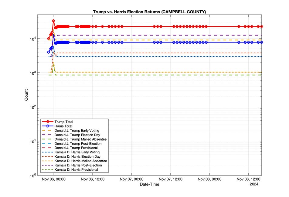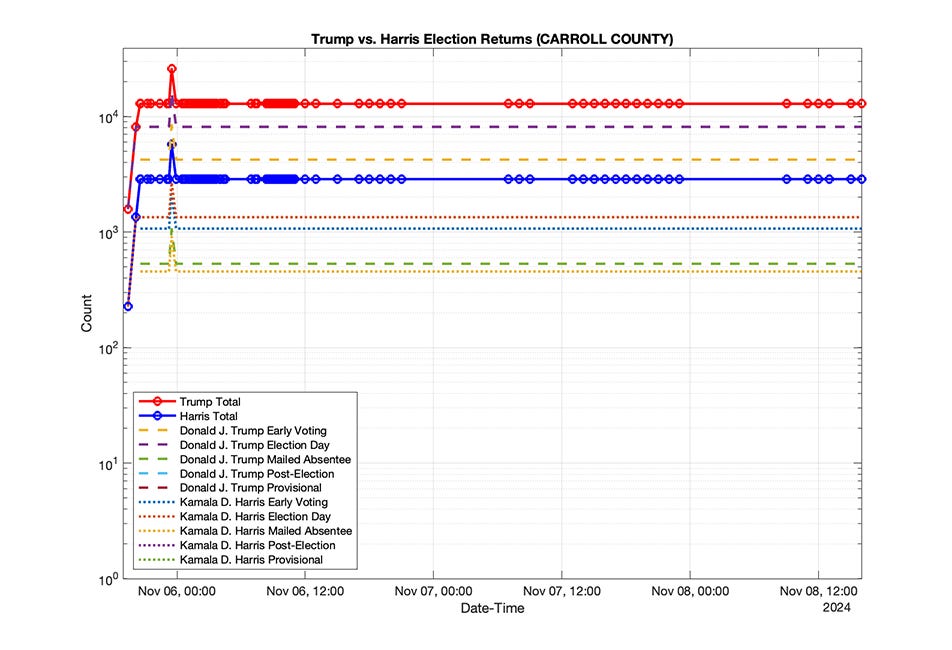 The images of data plots of a few of the counties (see below) show this “glitch” in the data feed, all occurring at midnight. We have not (yet) reached out directly to ELECT or any of these counties to inquire as to the reason. We will update if we find out anything as to the cause of this “glitch.” (Mobile readers can “pinch up” the images.)