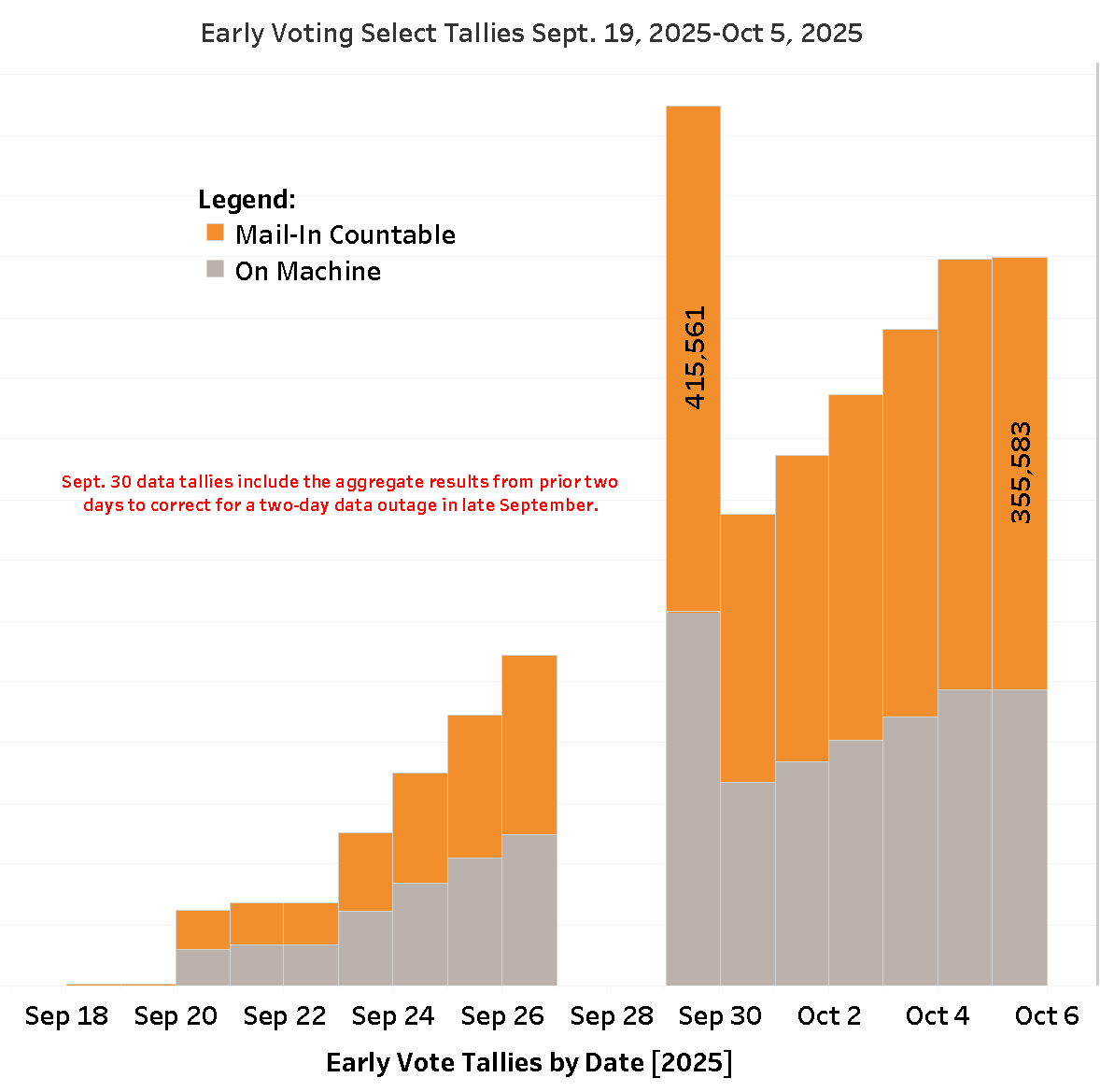 As of Saturday, Oct. 4th, the number of “countable” ballots was 355,583, which reflects both the in-person voting tally (243,254), and mail-in ballots that are either “marked” or “pre-processed.”