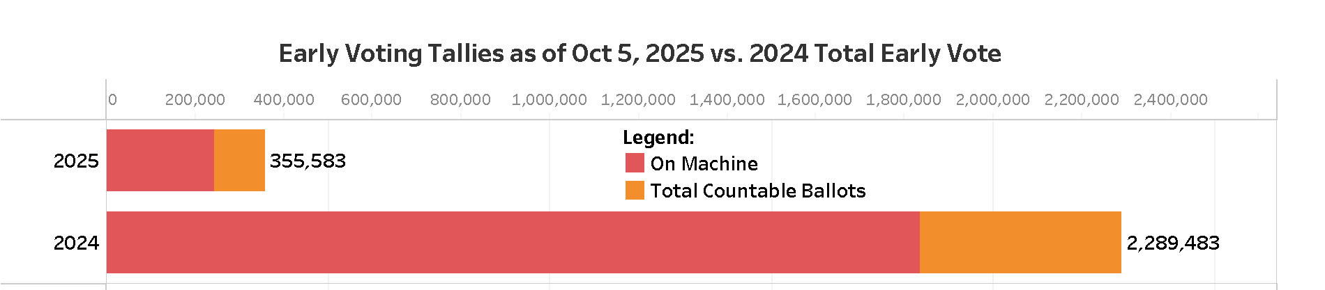 In all, some 553,282 absentee mail-in ballots appear to be approved for early voting, similar to the turnout for the 2024 presidential election last year when 70% of the electorate voted.